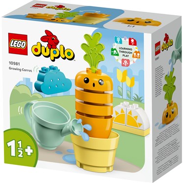 Code produit : 10981Le jeu d’éveil La carotte qui pousse LEGO® DUPLO® My First (10981) offre aux tout-petits de 18 mois et plus l’opportunité d’apprendre les bases d’une vie saine et de la croissance des plantes en s’amusant. Ce set coloré est conçu pour les initier à la vie en autonomie en leur apprenant à prendre soin de la carotte et à empiler les briques pour la faire pousser. Laissez les enfants d’âge préscolaire faire la pluie et le beau temps avec les briques « soleil » et « pluie », pour donner à la plante ce dont elle a besoin pour croître. Si nécessaire, ils peuvent également lui donner à boire avec l’arrosoir. À en juger par l’expression de surprise sur le visage de la carotte, l’eau doit être froide !